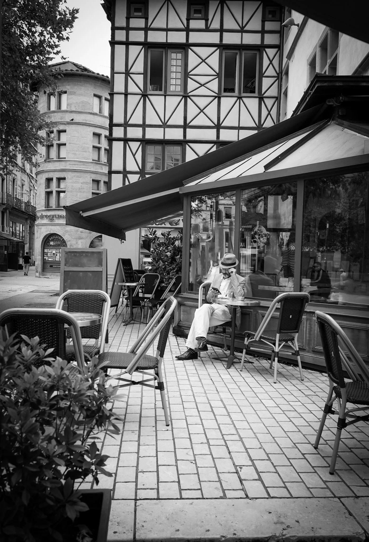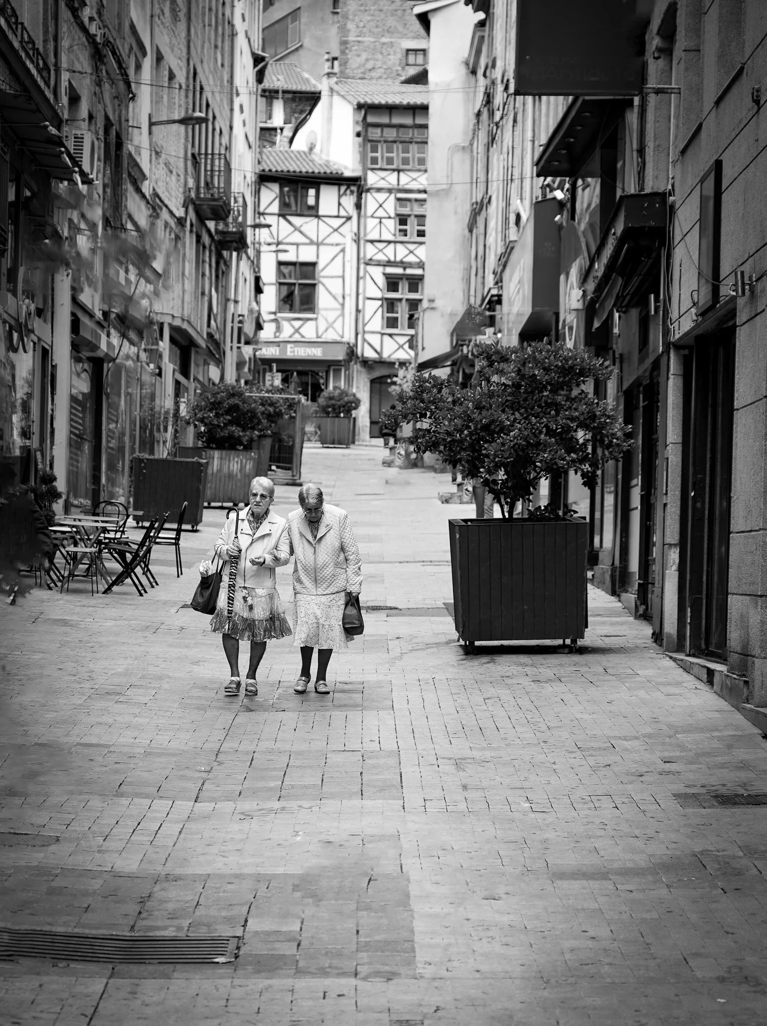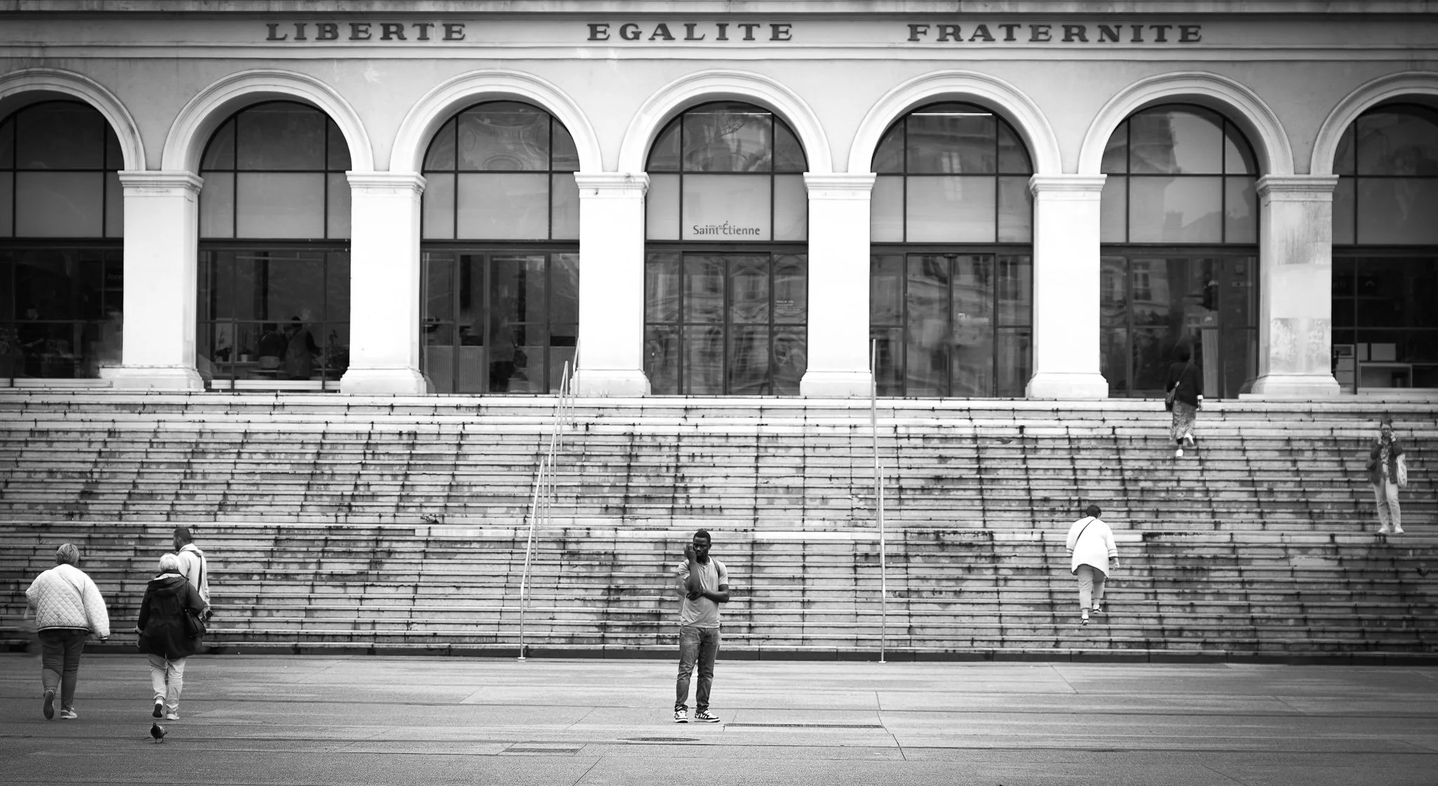 En parallèle, une seconde série plonge dans le présent à travers une série de “photos de rue” : le quotidien des Stéphanois, les battements de la rue, les gestes, les regards. Ce travail capte la poésie du mouvement et de la vie, là où l’instant prend la forme d’une composition urbaine, vibrante et sensible. Grands Tirages (+ 2m de hauteur) en technique d’impression sur panneaux / noir et blanc.